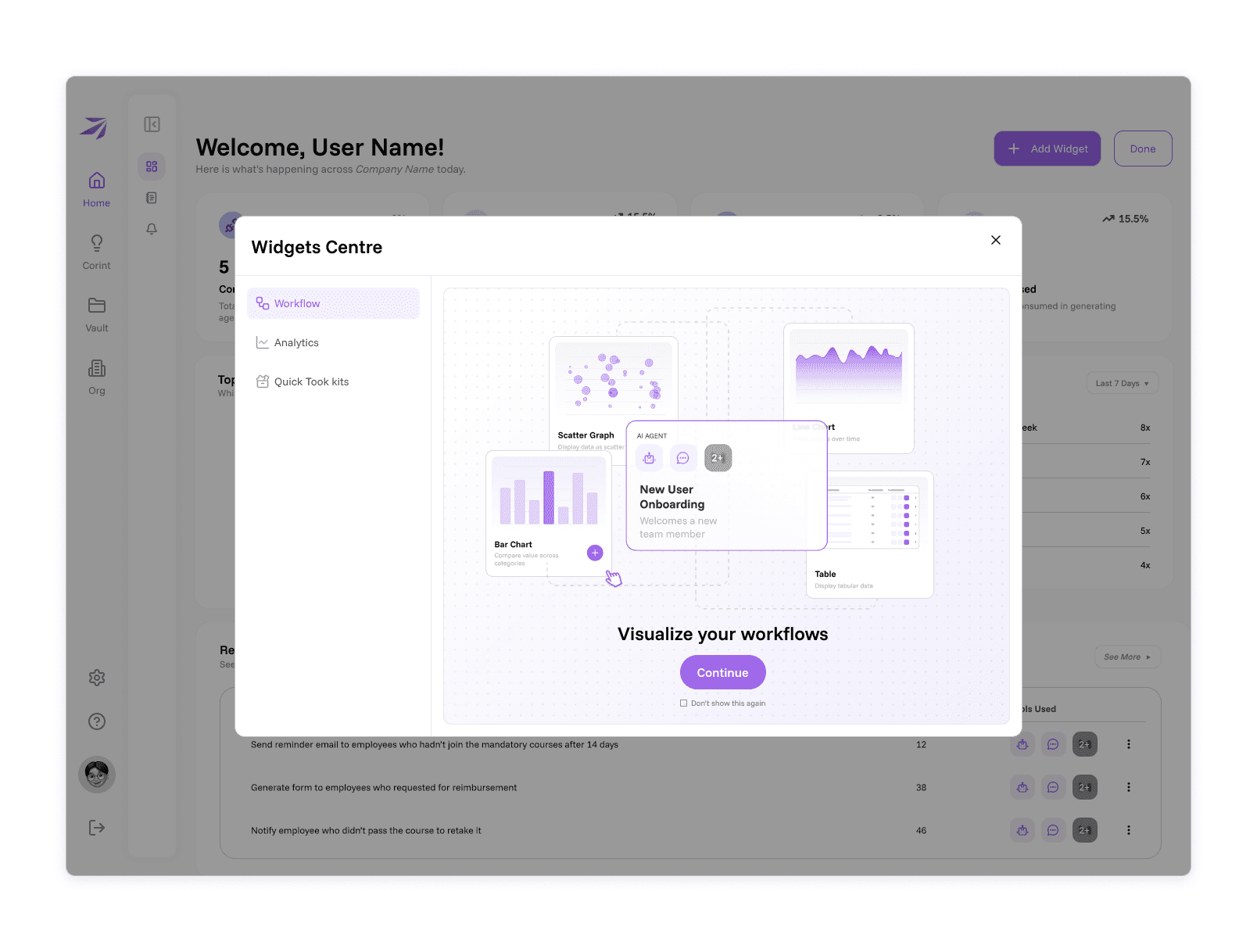 A modular set of widgets designed to visualize AI workflows and enable quick, in-context actions across enterprise dashboards.