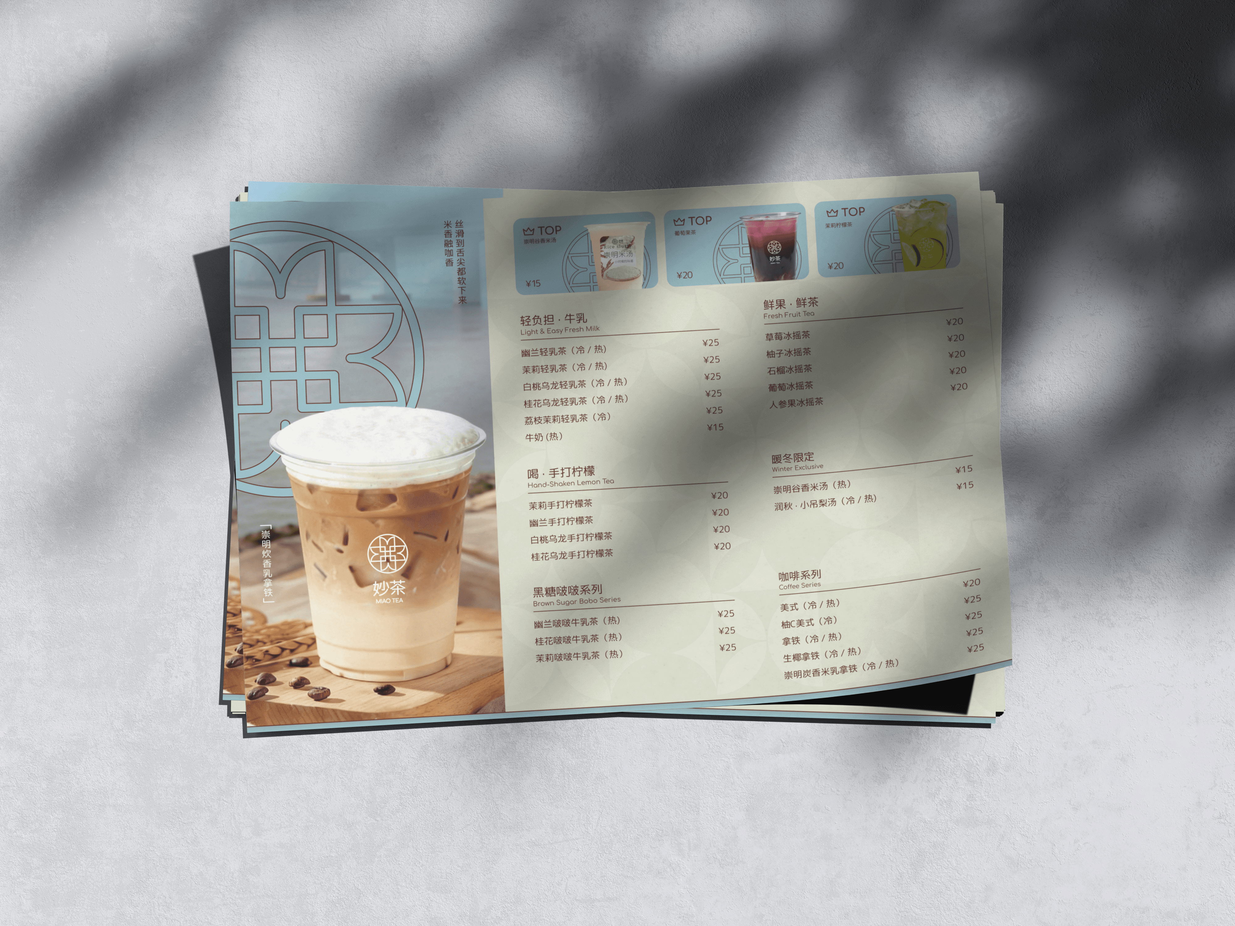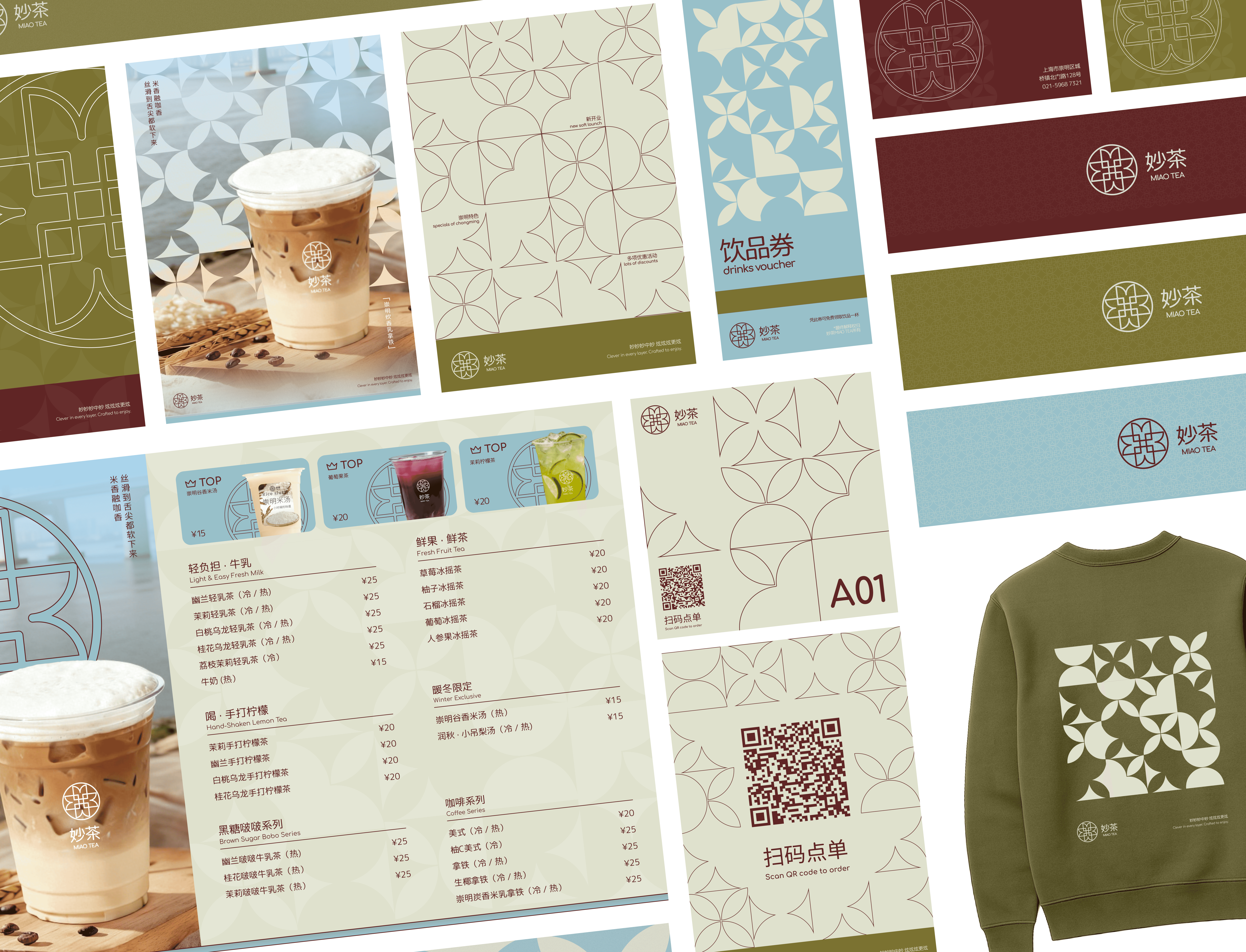 MIAOTEA is a boba and tea brand rooted in Chongming, Shanghai, a quieter, more residential area distinct from the city’s dense urban core. The brand draws from the region’s calm rhythms, open landscapes, and everyday rituals of tea, offering a more grounded and reflective alternative to high-energy bubble tea chains.